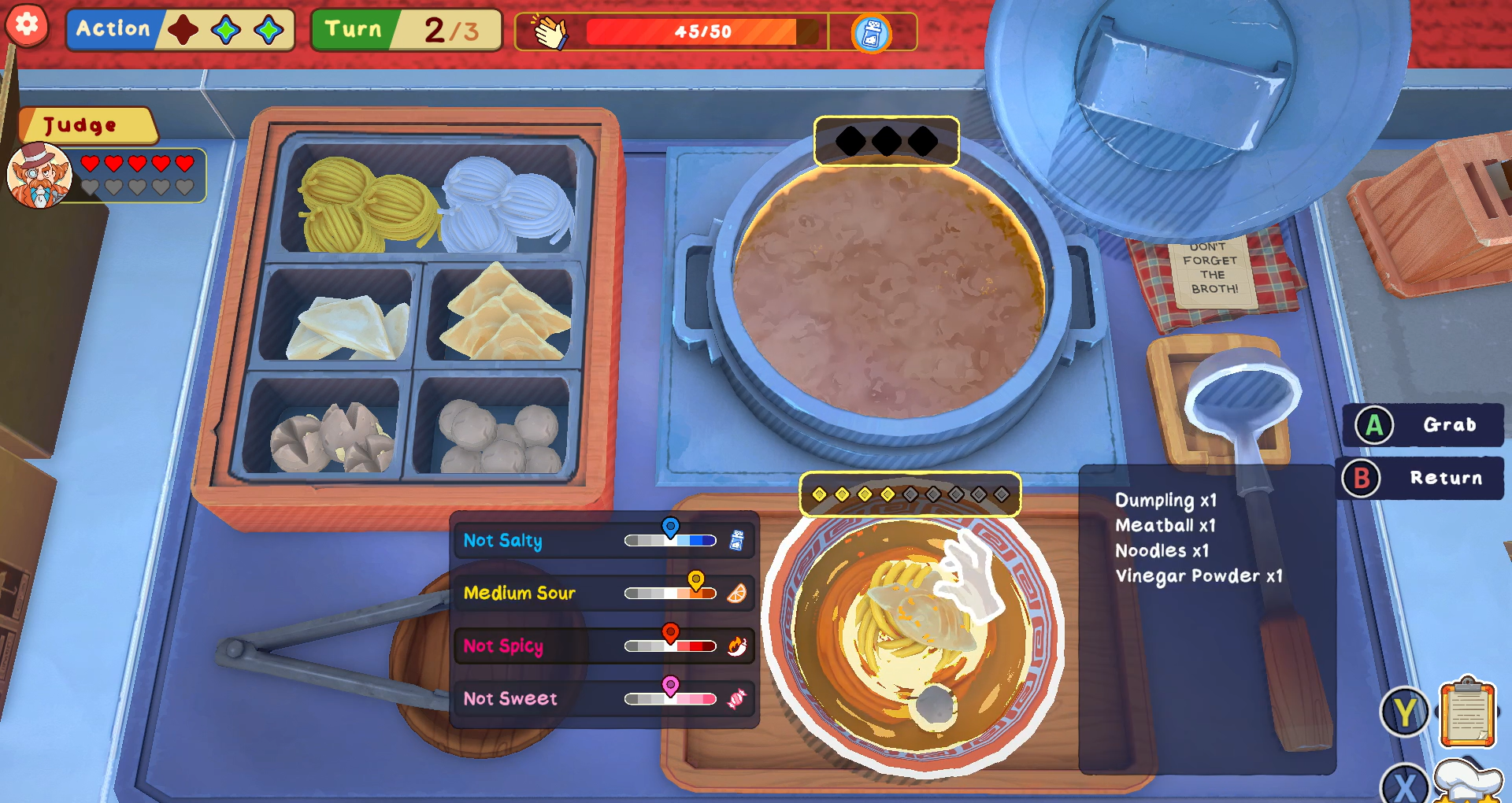 I also really like the Meatball Brawl sections, where it becomes a turn-based strategy game about satisfying the judges with the most impressive soup. I thought there was a perfect amount of complexity to keep my creative juices flowing while crafting my bowl. Final Thoughts