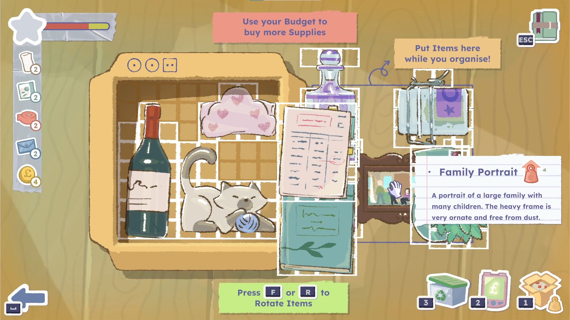 I also enjoyed the gameplay mechanic of auctioning items. It was a fun challenge to try and guess which items were valuable, and it has real bearing on the game as well, because you can use some of the profits to buy packing supplies.